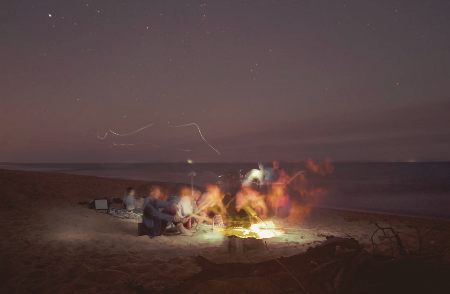 Feeling the tranquil pleasure of being near a gathering but not quite in it—hovering on the perimeter of a campfire, chatting outside a party while others dance inside, resting your head in the backseat of a car listening to your friends chatting up front – feeling blissfully invisible yet still fully included, safe in the knowledge that everyone is together and everyone is okay, with all the thrill of being there without the burden of having to be.